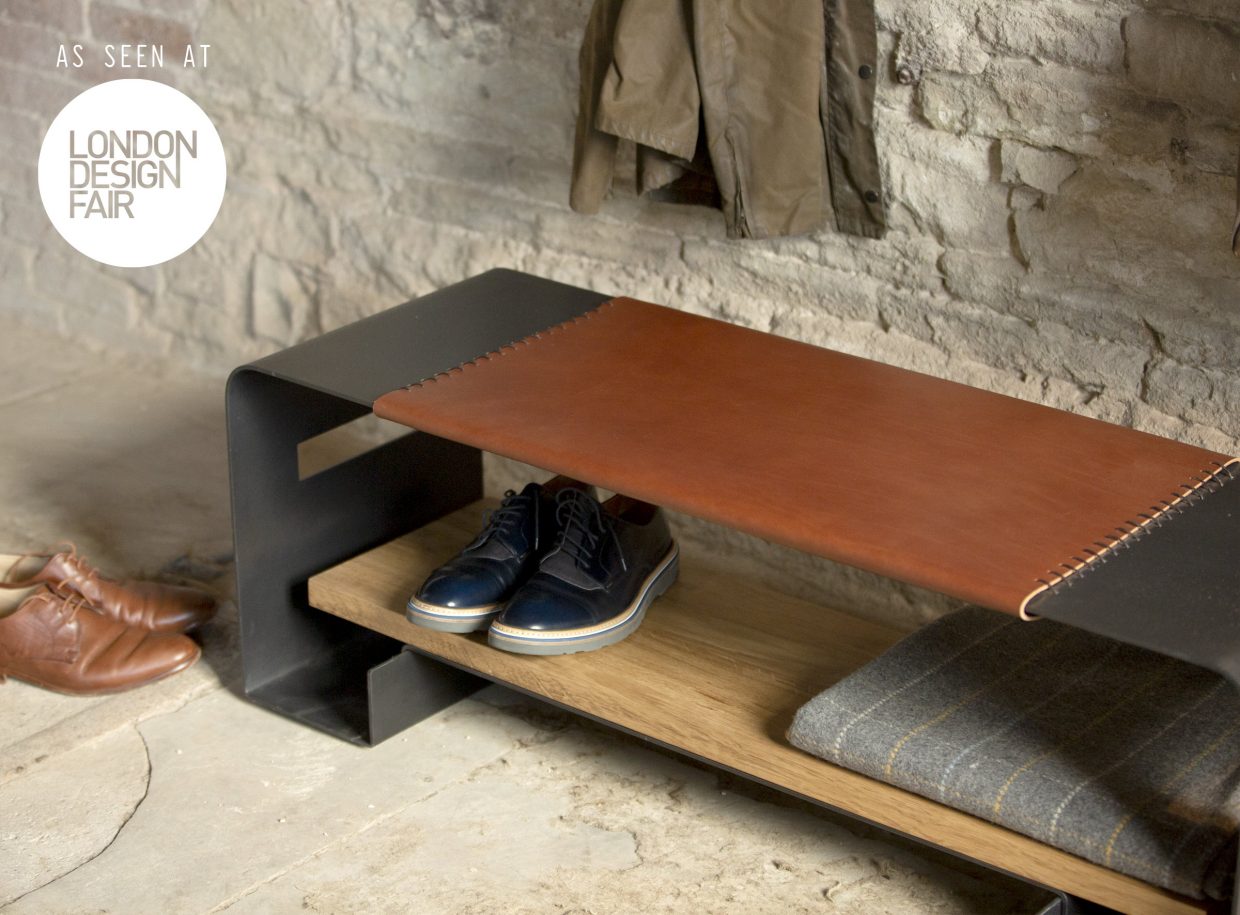 Steel Bench. The AMMIL steel bench is a solid, powder coated steel folded frame with feature handles, contrasting leather seat pad and solid oak under shelf.