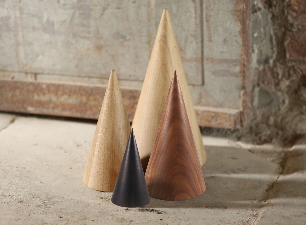 A solid, hand turned sculptural cone available in oak and walnut. Works well displayed in multiples.