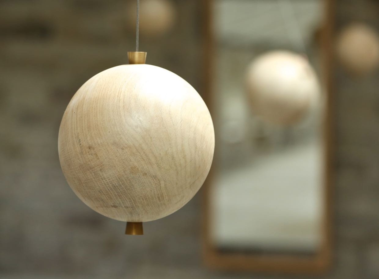 Nevada Oak Hanging Ball. A solid oak hanging ball, hand turned sculptural ball hung on a stainless steel wire rope from brass fixings. Works well in multiples. (6kg – please ensure you have a suitable ceiling construction or beam to hang these from)