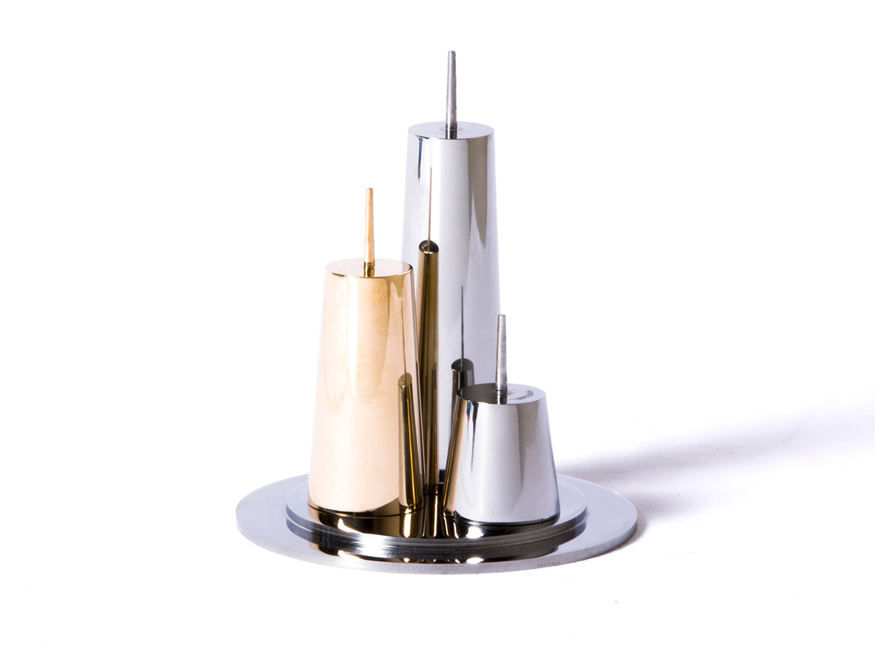 A solid metal candle holder set with reversible base and 3 different height holders. Can be used with both a dinner or pillar candle. Available in mild, blackened and polished steel complete with contrasting solid bronze medium holder.